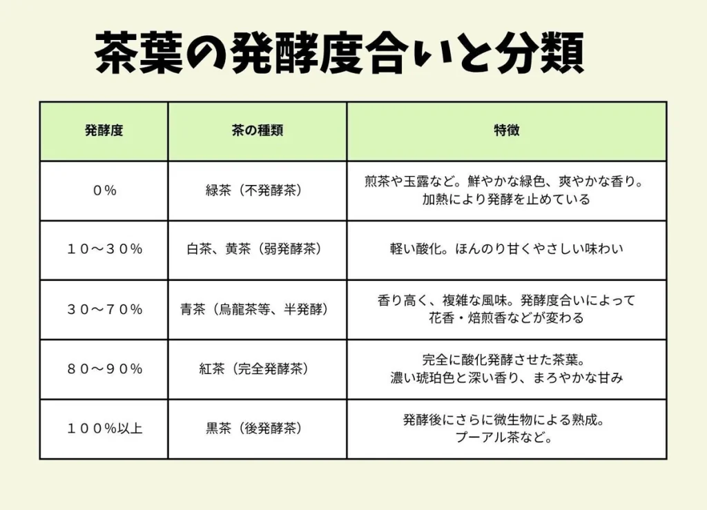 発酵について身近なものでイメージしやすいように「茶葉」で例えると上の表のような違いがあります。